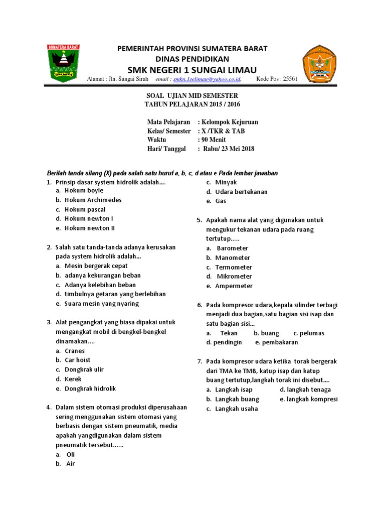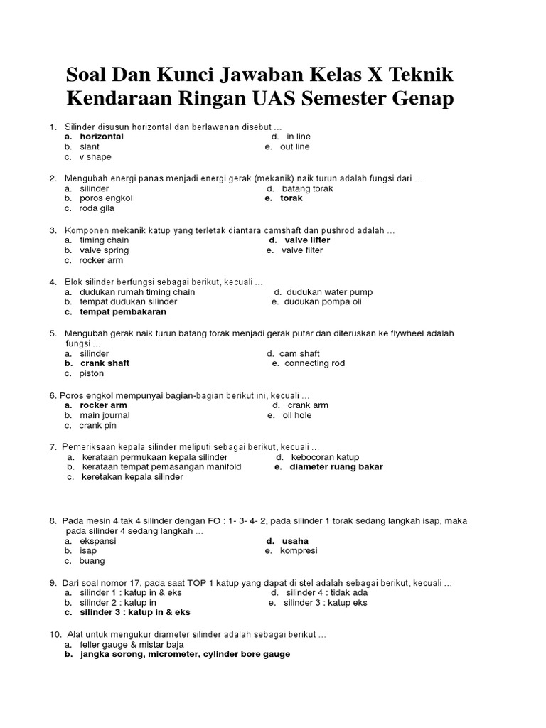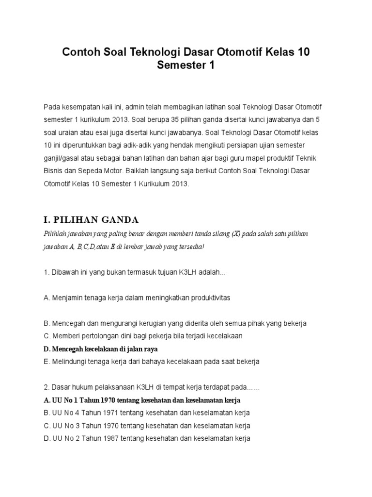 Soal Essay Pdto Kelas X Tkr Pdf from imgv2-2-f.scribdassets.com Contoh soal pai kelas 10 semester 2 beserta jawabannya pilihan ganda bagian pertama pilihan ganda teladan soal pendidikan agama islam dan budi pekerti kurikulum 2013 k13 kelas x semester 2 beserta jawabannya berisikan bahan yang sama dengan soal essay bab pertama yaitu perihal beriman kepada malaikat. Indonesia kelas 10 semester genap k13 beserta jawabannya, untuk siswa sma/ma/mak/smk/sederajat 1. Soal tdo ini terdiri dari soal kesehatan keselamatan kerja k3 klasifikasi engine cara kerja engine 2. Soal ini sudah kakak susun sebanyak 25 soal yang terdiri dari 20 soal pilihan ganda dan 5 soal essay. Pada kesempatan kali ini, admin telah membagikan latihan soal teknologi dasar otomotif semester 1 kurikulum 2013. Soal tdo ini terdiri dari soal kesehatan keselamatan kerja (k3), klasifikasi engine, cara kerja engine 2 dan 4 langkah, pembentukan dasar logam, dasar hidrolik, dasar pneumatik, dasar kelistrikan, dasar elektronika, dan baterai. Soal bahasa indonesia kelas 6 dan kunci jawabannya semester 2. Untuk soal tdo anda bisa baca 50 soal teknologi dasar otomotif kelas x lengkap beserta kunci jawaban.