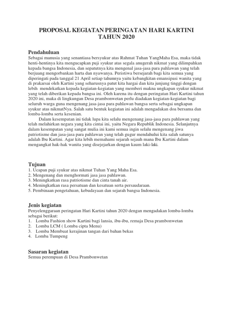 Text of proposal hari kartini. Instruksi bersama kakandepdiknas gresik, no. Hari kartini yang bertepatan pada tanggal 21 april yang biasanya dirayakan/diperingati oleh masyarakat indonesia dalam rangka untuk menghargai perjuangan r.a. Sma negeri 1 cikalong wetan. R.a.kartini adalah sosok perempuan yang menjadi pelopor emansipasi wanita di indonesia.beliau berjuang untuk mengangkat derajat perempuan indonesia.