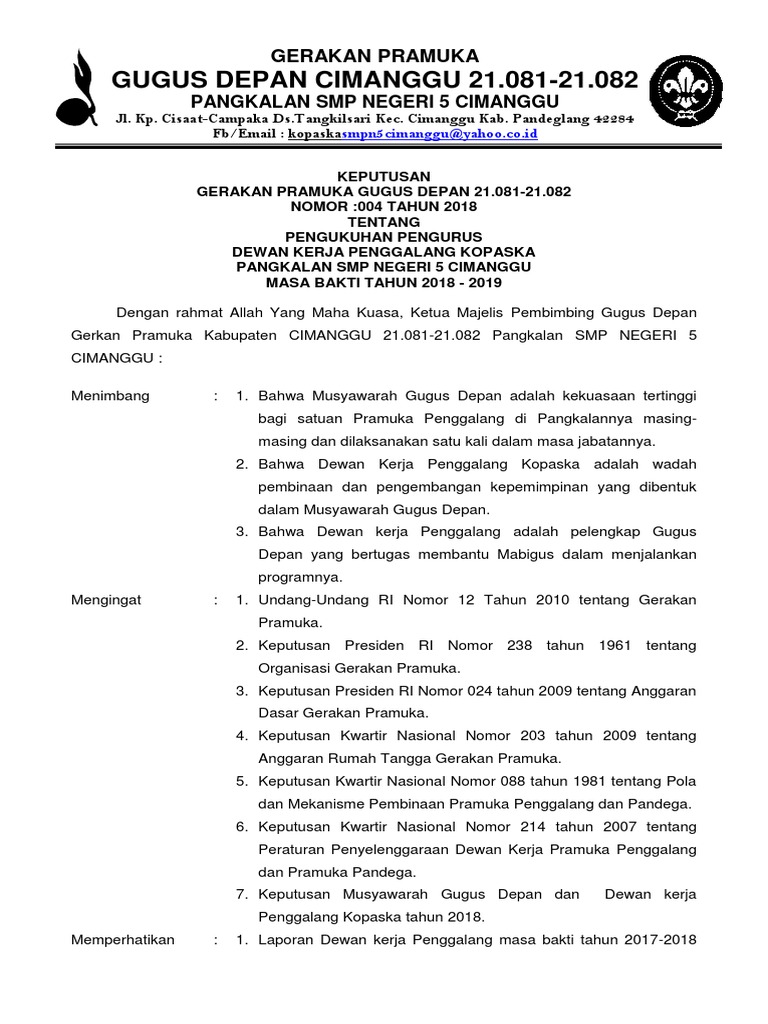 Pengurus kwarnas diketuai oleh ketua kwarnas (disingkat ka kwarnas). Se penafsiran pasal 23 (ayat3)ad gp: Halo sobat siswasiana, pada postingan ini saya akan share contoh surat keputusan (sk) pembina pramuka terbaru tahun palajaran 2019/2020 yang bisa anda unduh secara gratis. Unduh 17 sk kapusdiklatnas +kapuslitbangnas+kapusinfo+waka pusdiklatnas kwarnas 2019 unduh: Dalam rangka peringatan hut gerakan pramuka ke 50 tahun 2018/2019. Keputusan ini, mulai berlaku sejak tanggal ditetapkan yaitu 10 april 2018. Berdasarkan tingkatan/wilayahnya, kwarnas berkedudukan di ibu kota negara, jakarta. Sk pembina pramuka di buat oleh kepala sekolah. Sebelum saya membagikan contoh format sk ektrakurikuler pramuka maka berikut ini tampilan yang dapat anda lihat dari format sk ektrakurikuler pramuka yang akan saya bagikan. Sk tersebut dikhususkan untuk kepala sekolah yang akan membuatnya untuk guru guru yang ditugaskan. Bahwa dengan telah diselenggarakannya musyawarah ranting gerakan pramuka. Berikut tampilan (preview) pada contoh sk yang sekaligus dapat anda download melalui link dibawahnya. Sk pembina pramuka tahun 2020/2021.